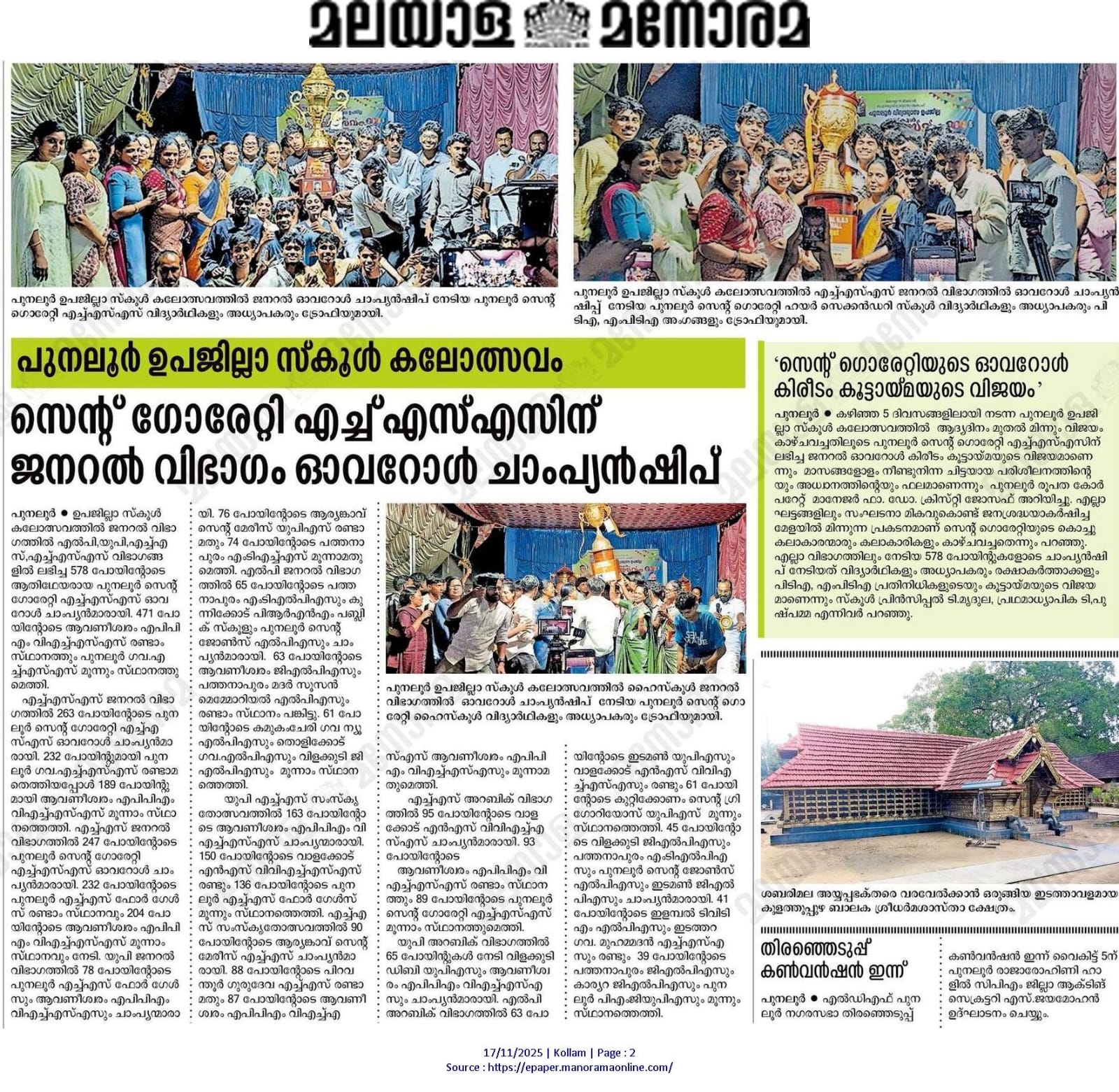 കൗമാര കലാ പ്രകടനങ്ങളുടെ വസന്തം തീർത്ത പുനലൂർ സബ്ജില്ലാതല സ്കൂൾ കലോത്സവത്തിൽ തുടർച്ചയായ നാലാം തവണ ഹൈസ്കൂൾ വിഭാഗം ജനറൽ ഓവറോൾ ചാമ്പ്യൻഷിപ്പ്, തുടർച്ചയായ അഞ്ചാം തവണ ഹൈസ്കൂൾ വിഭാഗം അറബിക് ഓവറോൾ ചാമ്പ്യൻഷിപ്പ്, തുടർച്ചയായ രണ്ടാം തവണ യുപി വിഭാഗം സംസ്കൃതം - ഓവറാൾ ചാമ്പ്യൻഷിപ്പ് ഫസ്റ്റ് റണ്ണറപ്പ് കിരീടം എന്നിങ്ങനെ ഒരുപിടി സുവർണ്ണ നേട്ടങ്ങൾ വിദ്യാലയത്തിന് സമ്മാനിച്ച കലാപ്രതിഭകൾക്ക് അനുമോദനമൊരുക്കി പുനലൂർ സെന്റ് ഗൊരേറ്റി.